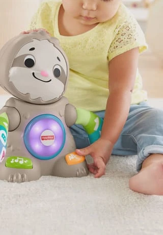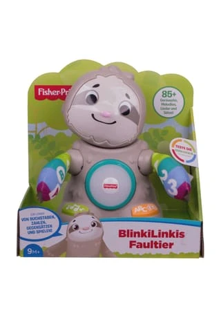 Das BlinkiLinki Faultier bringt das Baby körperlich und geistig in Schwung – mit spannenden Lichteffekten, Musik, Liedern und groovigen Tanzbewegungen. Drückt das Baby die Knöpfe an den Füßen des Faultiers, wird ihm alles über die Zahlen, Farben usw. erzählt. Dabei klatscht das Faultier in die Hände und nickt mit dem Kopf. Trifft das BlinkiLinki Faultier auf seine BlinkiLinki Freunde, begeistern die niedlichen Tiere ihr Publikum mit synchronen Klang- und Lichteffekten! Weitere BlinkiLinki Tiere separat erhältlich. Wo die Entwicklung ins Spiel kommt – erste Lernerfolge: Die spielerischen Lieder und Sätze des Faultiers bringen dem Baby die Zahlen, Farben, Gegenteile und das Alphabet näher. Grobmotorik: Bewegen und Tanzen ist das Motto, wenn das Baby Musik und Lieder von dem Faultier hört – ein tolles Training für die Grobmotorik. Sensorik: Helle, bunte Lichter, lustige Musik und kuschelweiche Arme fördern die Sinne des Babys: Sehen, Hören, Fühlen.