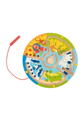Das perfekte Magnetlabyrinth von goki. Mit dem liebevoll umgesetzten Zoothema erhält das lehrreiche Spiel seine emotionale Seite, die für einen lang anhaltenden Spielanreiz wichtig ist. Gefördert werden die motorischen Fähigkeiten. Mit dem Magnetstab müssen die kleinen farbigen Metallkugeln in die entsprechenden Zielfelder geführt werden. Die Verläufe zu den Feldern sind so angelegt, dass sie als erste Schreibübung dienen. Fazit: 100% Spielspaß, 100% Lerneffekt – ganz stressfrei.