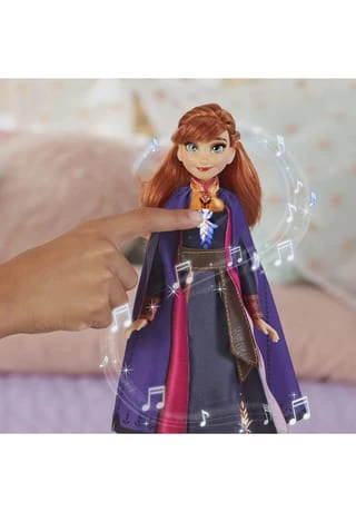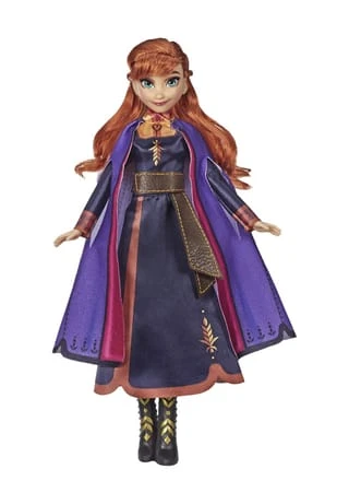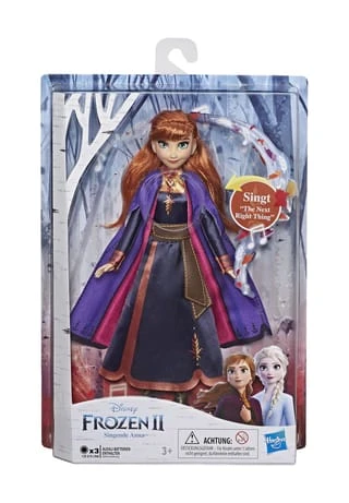 Im Disney Film Die Eiskönigin 2 wird Annas unerschütterlicher Optimismus und ihre Ausdauer weit weg von zu Hause auf die Probe gestellt. Sie muss lernen, auch dann stark zu sein, wenn es unmöglich scheint, und das Richtige tun. Die Singende Anna präsentiert sich mit langen, roten Haaren und trägt ein wunderschönes Outfit zum Film Die Eiskönigin 2. Einfach den Schalter an ihrem Rücken vom Demo-Modus in den Spiel-Modus bewegen. Wird dann der Knopf gedrückt, erklingt ein Ausschnitt von „The Next Right Thing“, dem Originalsong aus Die Eiskönigin 2. Auf Knopfdruck leuchtet Annas Kleid ganz zauberhaft auf, um mit einer der beliebtesten Figuren aus Disneys Eiskönigin die magischen Szenen nachzuspielen. Annas schwarzes Outfit beeindruckt mit lila- und pinkfarbenen Akzenten und kommt mit abnehmbaren Stiefeln. Es gibt auch die Singende Elsa zum Disney Film Die Eiskönigin 2 (separat erhältlich. Je nach Verfügbarkeit), um Lieder aus dem Film nachzusingen, während mit den beliebten Schwestern aus Arendelle die fantasievollsten Abenteuer zum Leben erwachen!