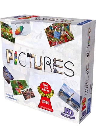 1 Spielregel, 1 Notizblock, 91 Foto-Karten, 19 Symbol-Karten, 48 Fotoauswahl-Plättchen, 1 Stoffbeutel, 4 Buchstaben-Plättchen, 4 Zahlen-Plättchen, 4 Pictures-Embleme, 1 Pictures-Bilderrahmen-Plättchen, 24 Farbwürfelchen, 4 Stöcke und 4 Steine, 2 Schnürsenkel, 6 Bauklötze