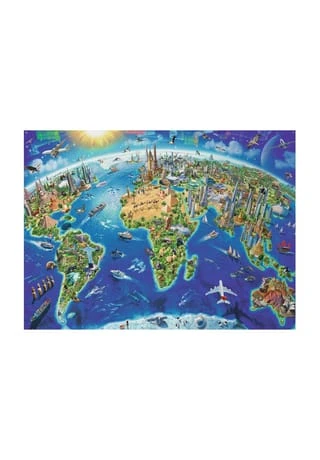 mit landestypischen Tieren und Bauwerken auf jedem Kontinent