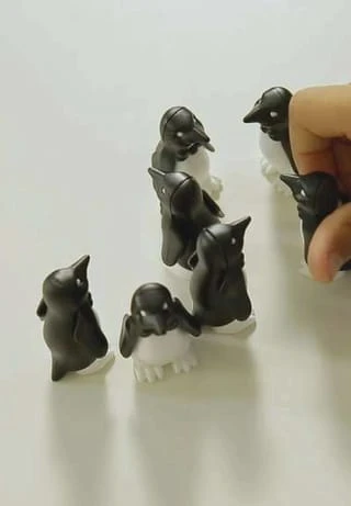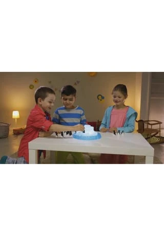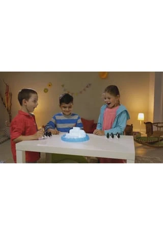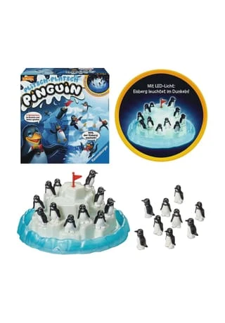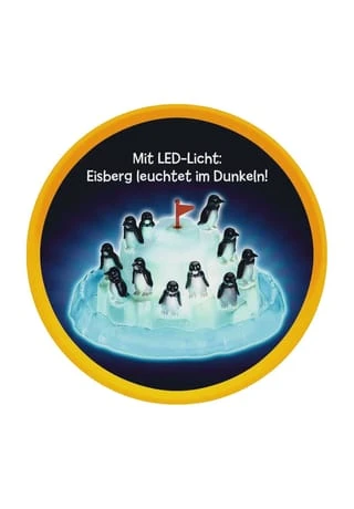 1 Spielbasis aus transluzentem Material, 1 Eisberg mit Fahne, 1 LED-Lampe, 20 Pinguine, 1 Pappring