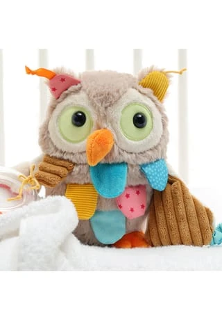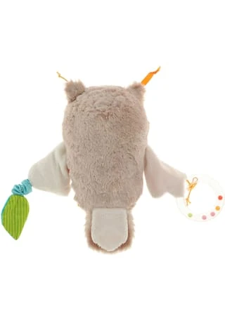 Die große Eule aus schmuseweichem Microfaserplüsch besticht durch ihren aufmerksamen Blick und ist ein echtes Multitalent. Da lässt der Spielspaß nicht lange auf sich warten! Die vielen unterschiedlichen Materialien sind exzellent verarbeitet und bieten ein haptisches Erlebnis für die Kleinsten. Was raschelt denn da? In den Schwanzfedern und im grünen Blatt sind Knisterfolien eingearbeitet und zwischen Blatt und Flügel ist eine Vibrationsrassel untergebracht. Zieht das Baby daran, rappelt das Blatt lustig an den Flügel der Eule zurück. Ein weiteres akustisches Highlight ist der Rasselring am rechten Flügel. Dieser kann auch gut als Greifring benutzt werden. So wird die kunterbunte Eule schnell Babys erster Freund und kreativer Spielkamerad, die Vielzahl an verschiedenen Funktionen laden ein, nach Lust und Laune zu forschen, zu (be)greifen und entdecken. Alle Materialien sind hochwertig verarbeitet und halten auch dem Bad in der Waschmaschine stand.