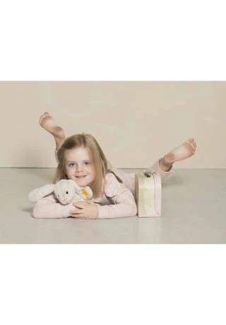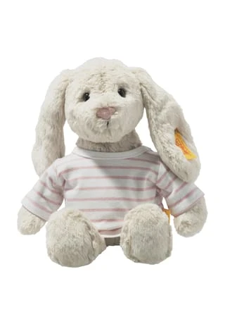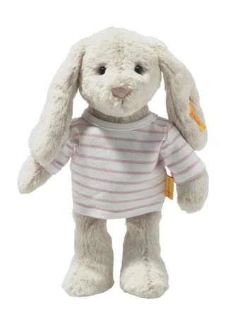 Ob gezielte Wunscherfüllung oder Überraschungsgeschenk: Kinderaugen leuchten, wenn Soft Cuddly Friends Hoppie Hase angehoppelt kommt. Er ist stylisher als je zuvor, mit seinem neuen T-Shirt ist er eine wahre Modeikone geworden! Der 26 cm große Hase mit seiner niedlichen rosa Nase und seinen überlangen Ohren ist für Klein und Groß ein liebevoller Begleiter für jeden Tag. Mit ihm kann man tolle Verstecke und Höhlen bauen. Da ist Hoppie Hase Spezialist. Die eingearbeiteten Granulatsäckchen am Gesäß, den Pfoten und den Sohlen sorgen für einen sicheren Halt. Der weiche und dichte Plüsch in zartem Hellgrau lädt zum Anschmiegen und Liebhaben ein. Mit diesem Kuschelhasen kann man prima das Greifen und Tasten lernen. Und in den Ruhepausen legt Hoppie Hase seine überlangen Ohren über das Gesicht seines Menschenfreundes und flüstert ihm wunderschöne Einschlafgeschichten zu.